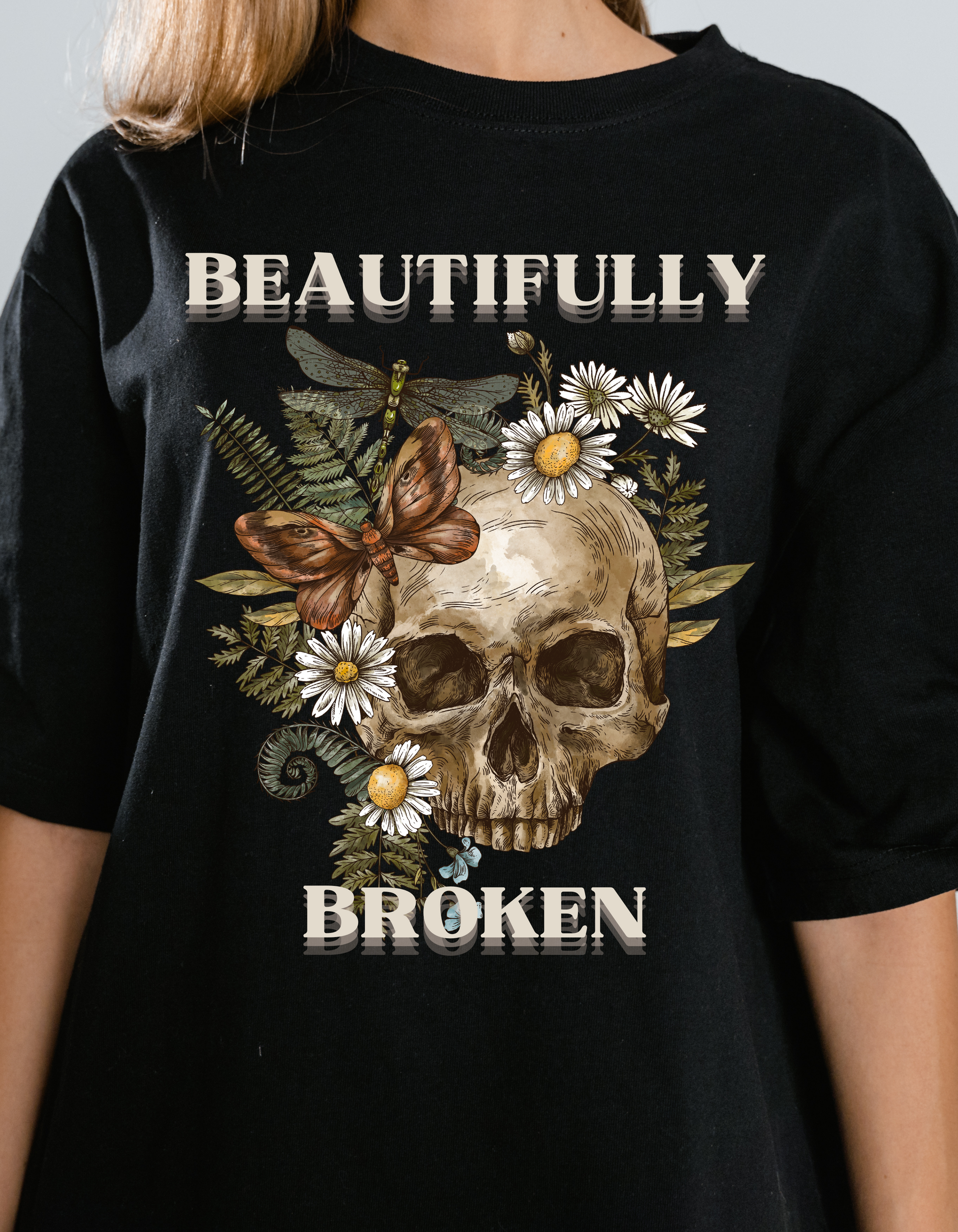 Embrace your inner strength with our Beautifully Broken t-shirt – a powerful blend of vulnerability and resilience. Featuring a hand-illustrated skull surrounded by delicate daisies, ferns, and a bold butterfly, this design captures the raw beauty in imperfection. Whether you rock it in black or white, this tee is a reminder that broken things can still be beautiful.