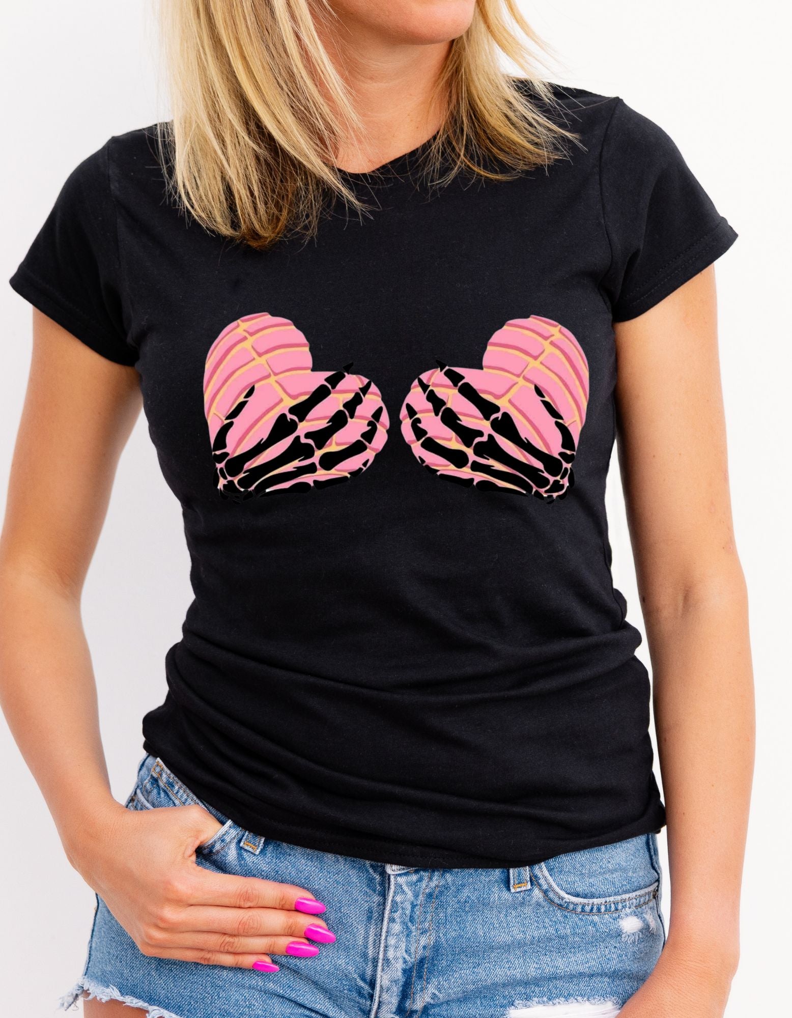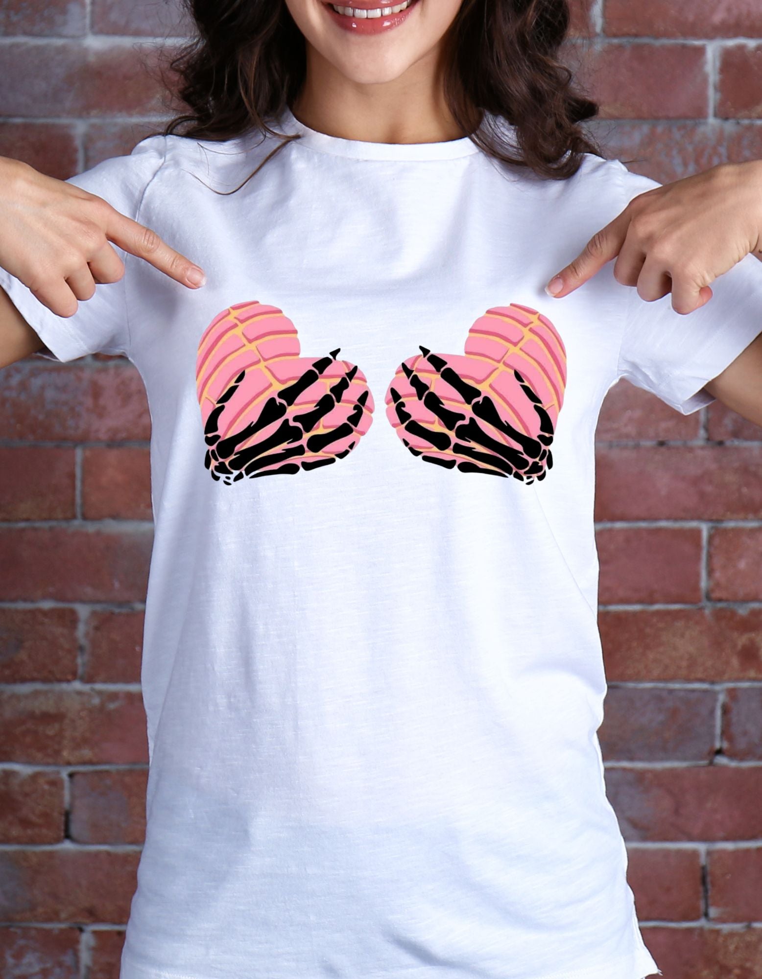 The Concha Grab Tee serves up just the right mix of sass and sweetness. Featuring iconic pink conchas clutched by skeletal hands right where it counts, this shirt is made for those who like their fashion with a little bite.